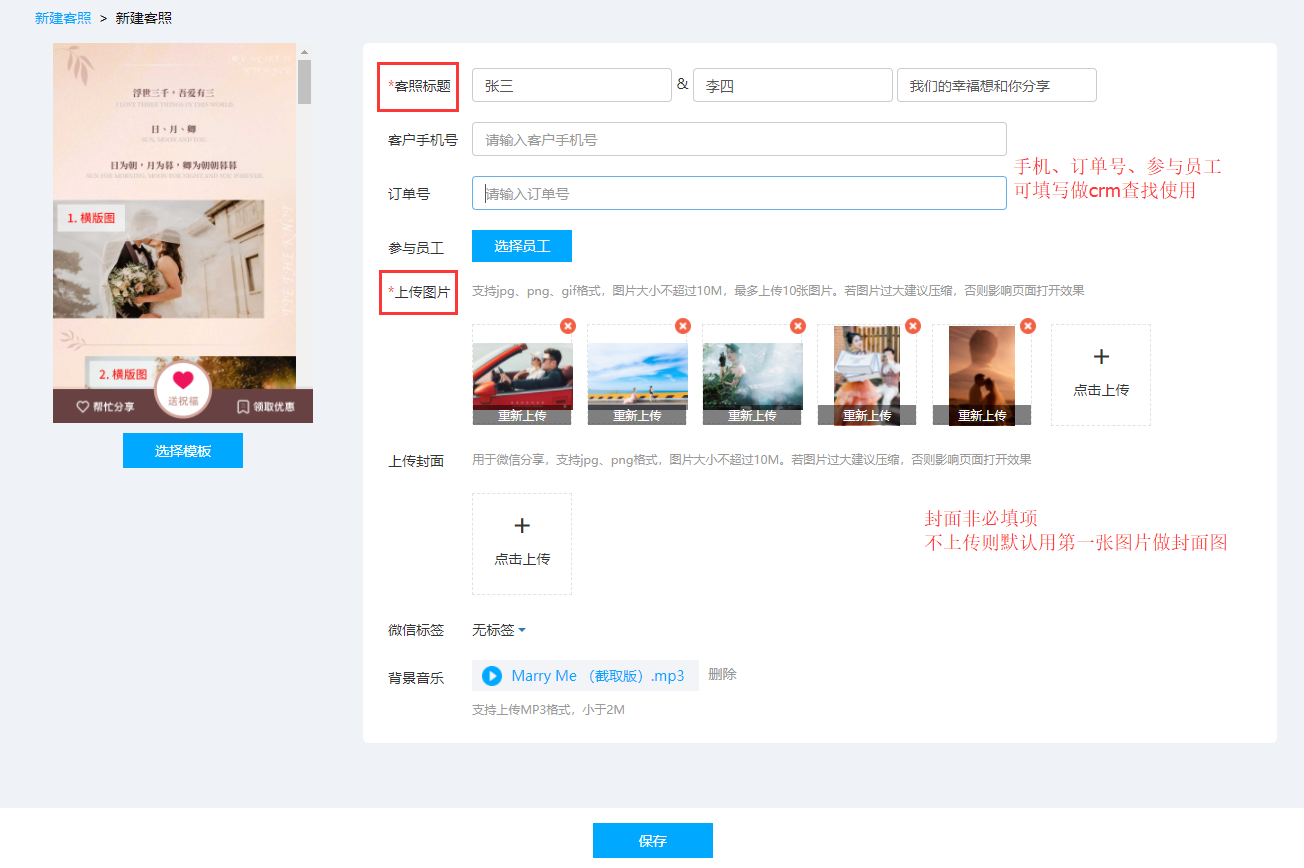 【手机号、订单号、员工】【上传封面】使分享封面不局限于第一张客照,可自定义分享传播时的图片。