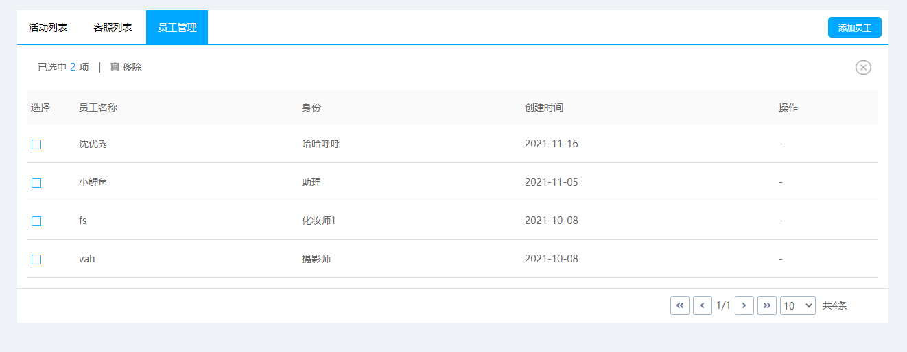 可对员工进行管理,明确客照的化妆师、摄影师、链接制作人等参与员工。