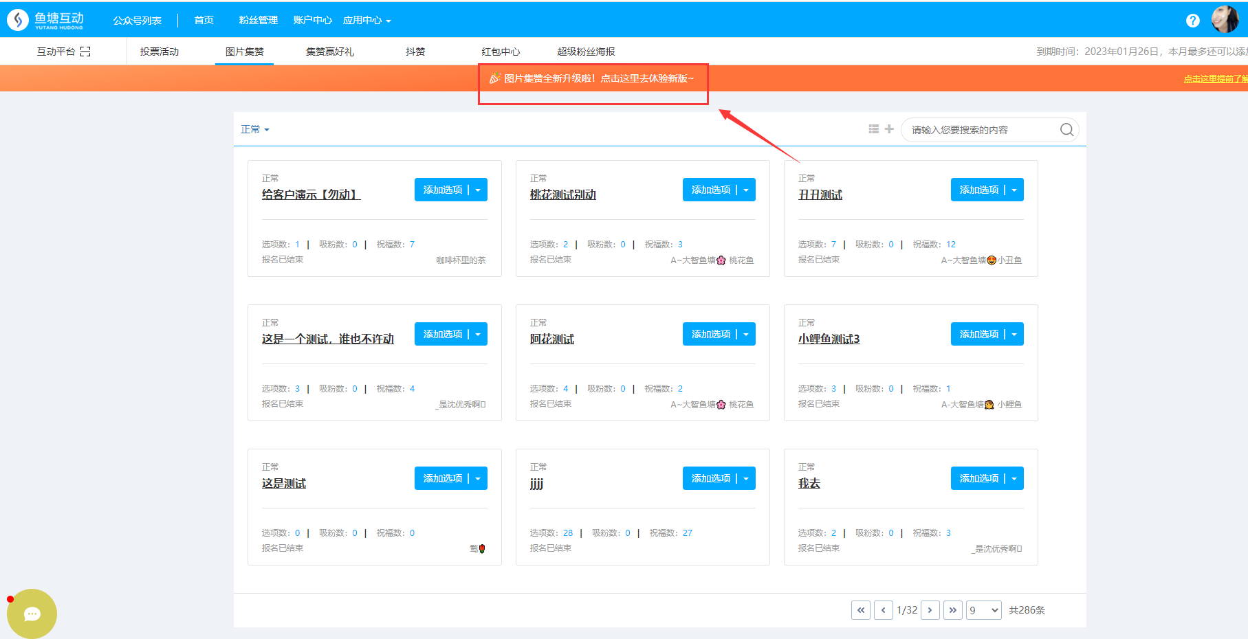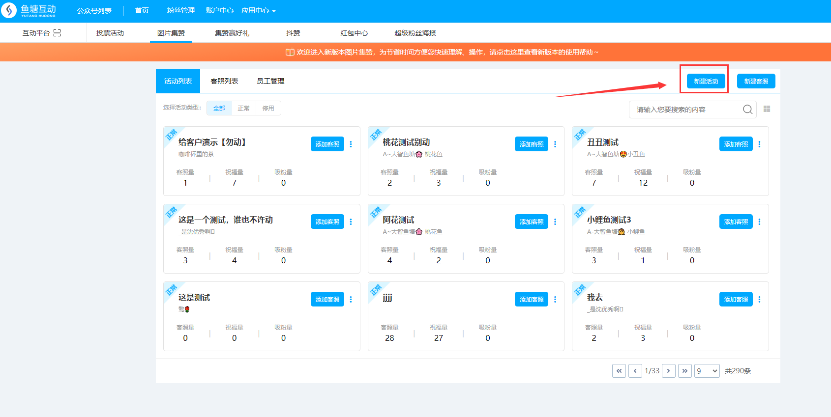 电脑端登陆鱼塘互动平台:http://wxpw.dzsaas.com/home/login ->选择“图片集赞”->点击“去体验新版”。