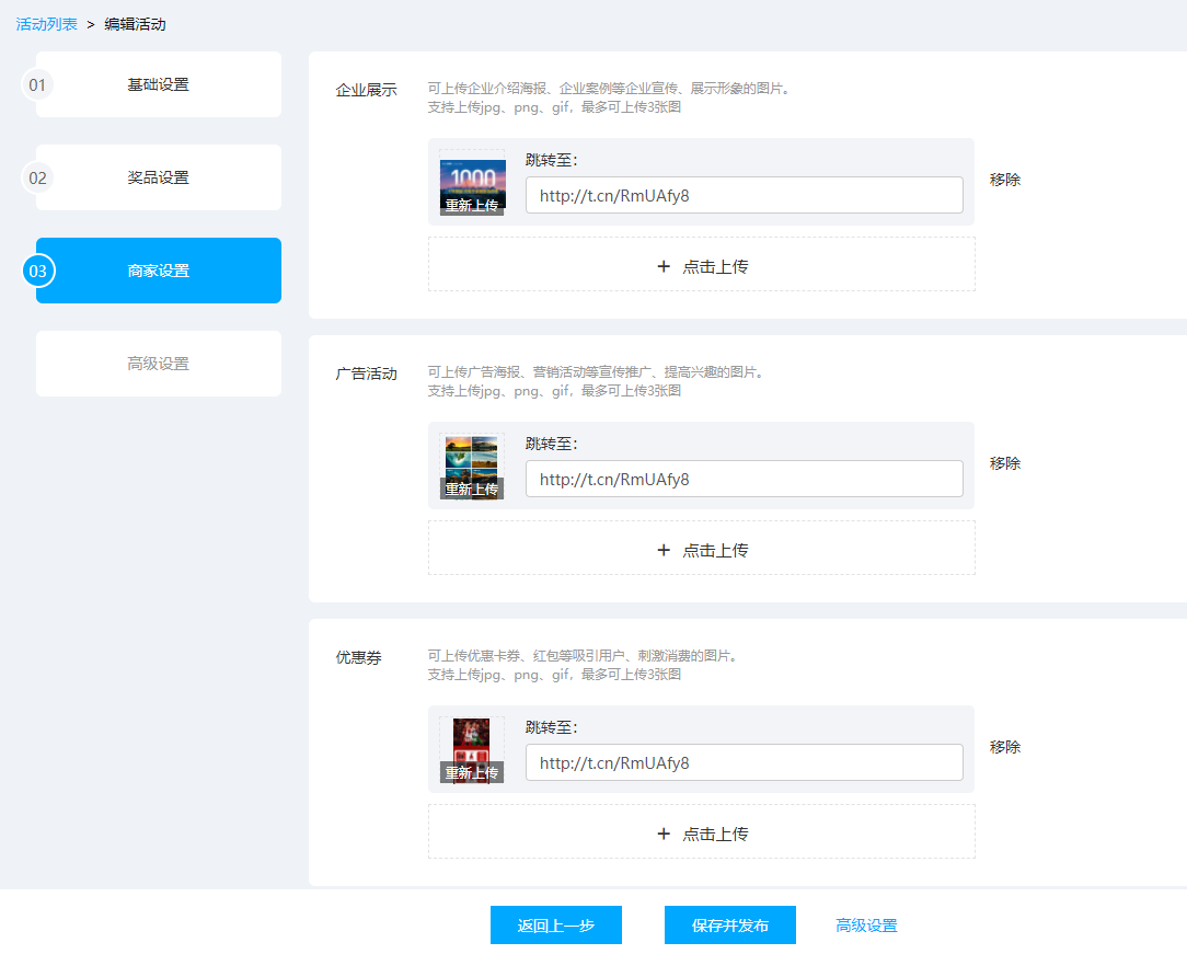 企业展示、广告活动、优惠券为推荐上传类型,均为图片形式且非必填项。