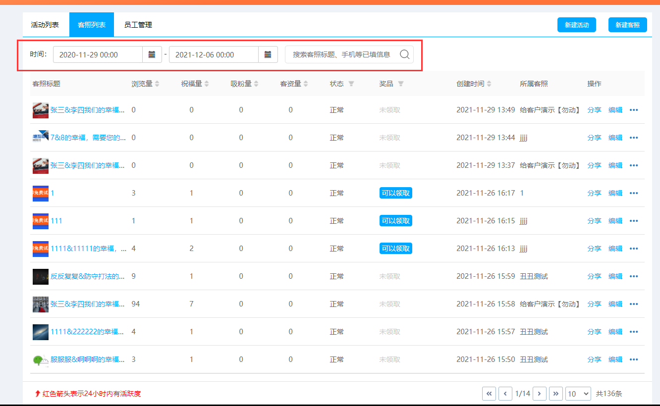 可根据时间、新人名称、手机号等已填信息,快速锁定查找指定客照。