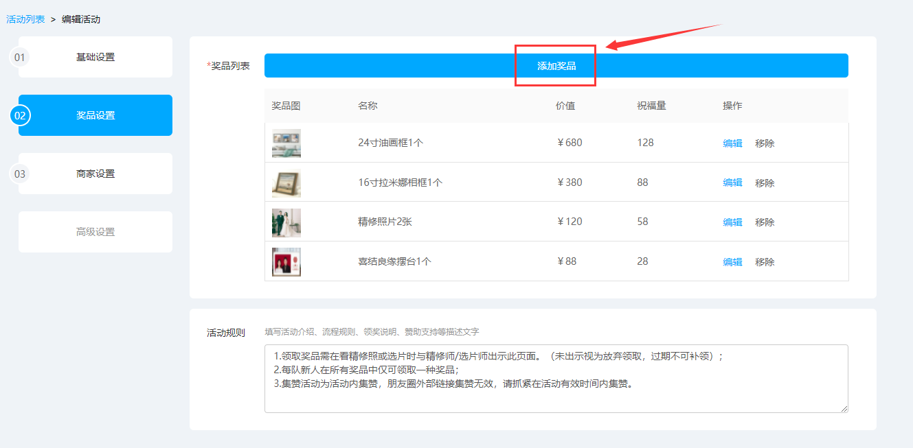 添加奖品->上传奖品图、奖品名称、奖品价值、需获取祝福数量->其他均可不做修改->保存并下一步。