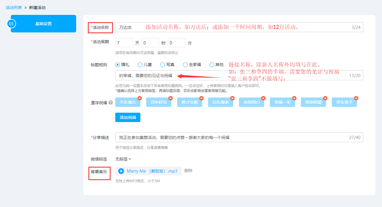 添加一个活动名称,如门店或时间->上传背景音乐->其他均可不做修改->保存并下一步。